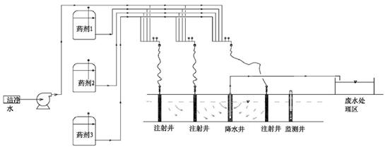 1)原理说明:通过注入井将氧化/还原药剂注入目标含水层中,氧化/还原药剂与含水层中的污染物发生反应,使其转化为无毒或相对毒性较小的物质,从而达到净化效果的一种原位修复技术。